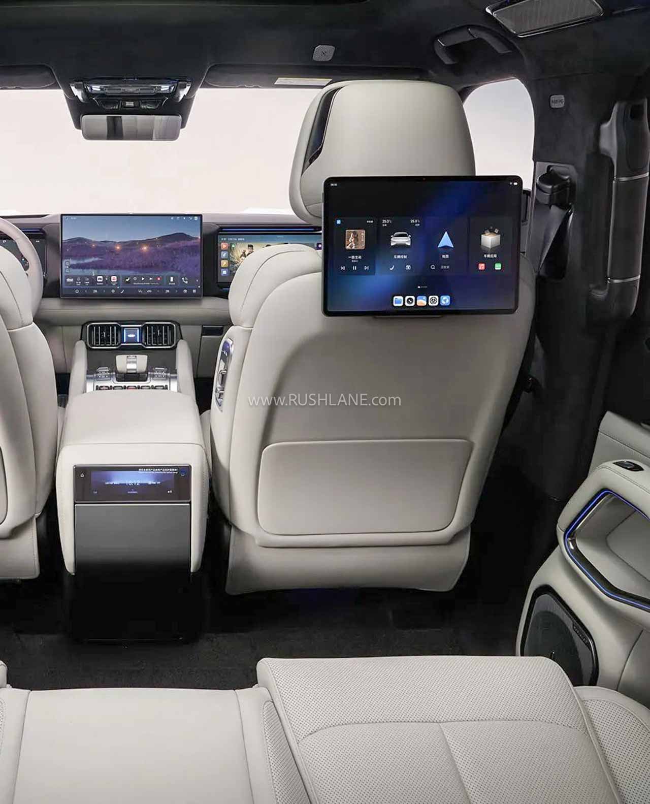 It looks like there are physical controls in the center console and steering wheel, too. Other notable features are a 50-inch AR-enabled HUD, wireless charger, floating effect for the center console, 18-speaker audio system, 2+2+2 or 2+3+2 seating layout options, Huawei’s Qiankun ADS 3.0 (ADAS suite), BYD’s own BYD9000 chip.