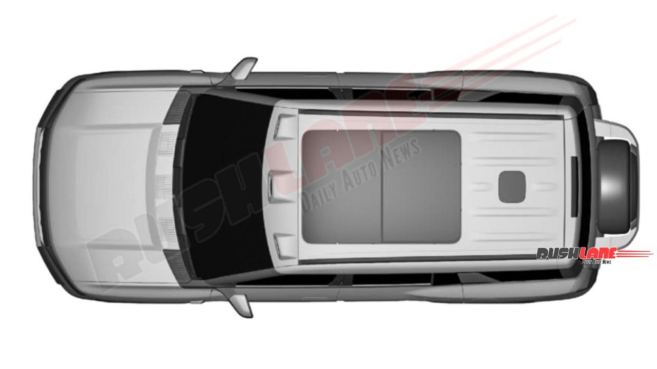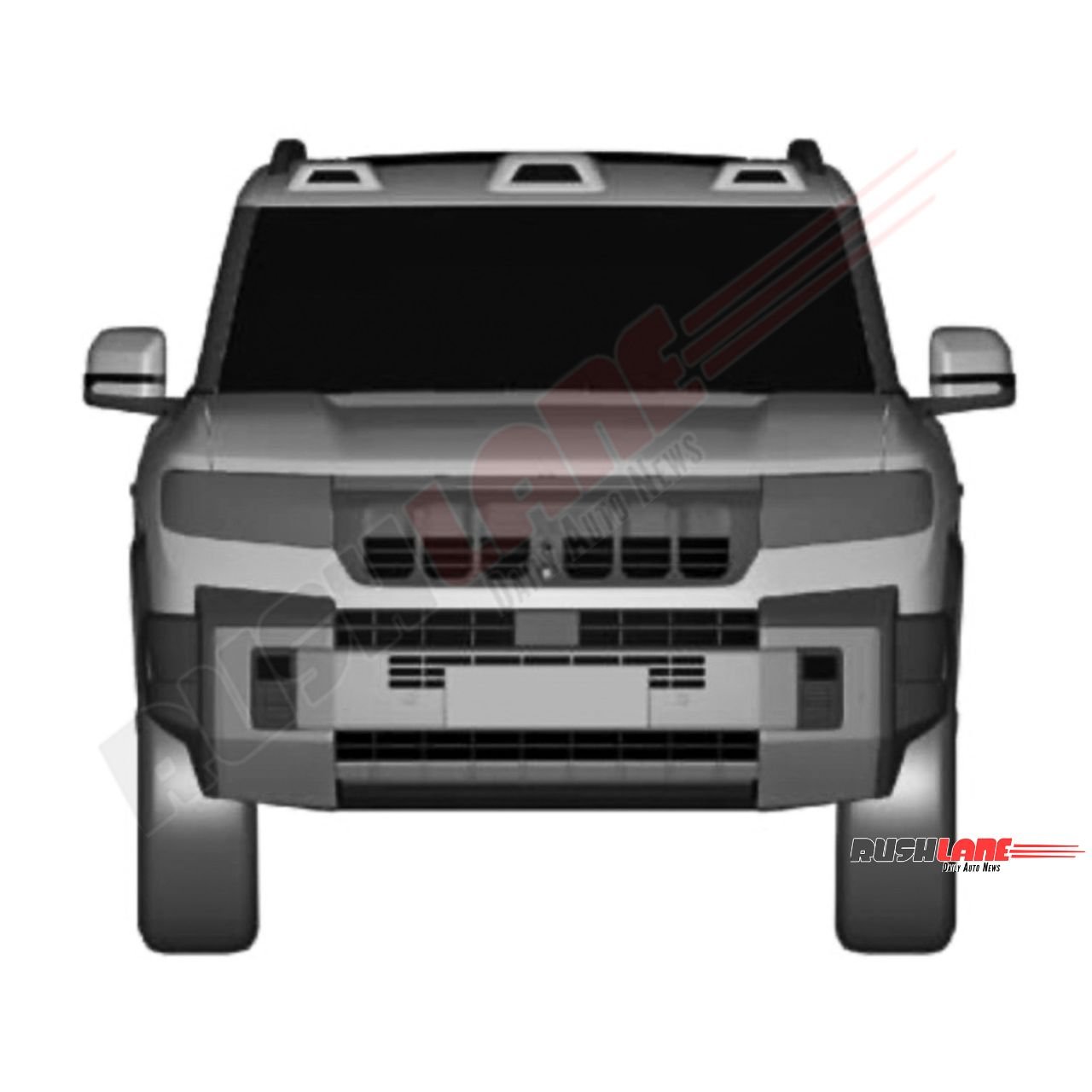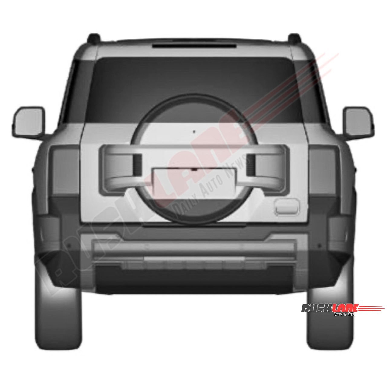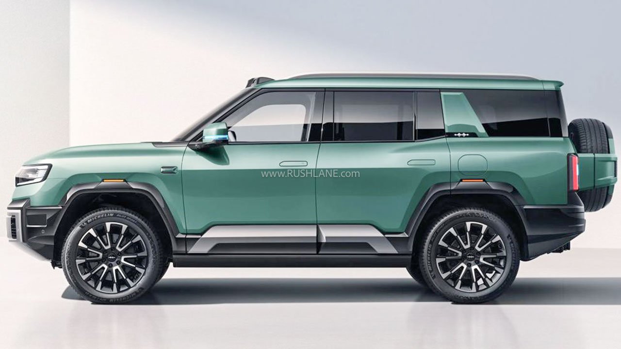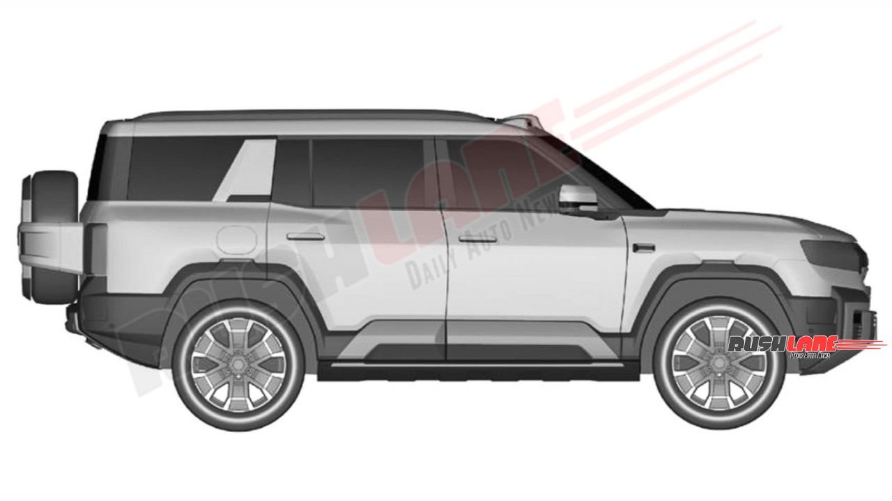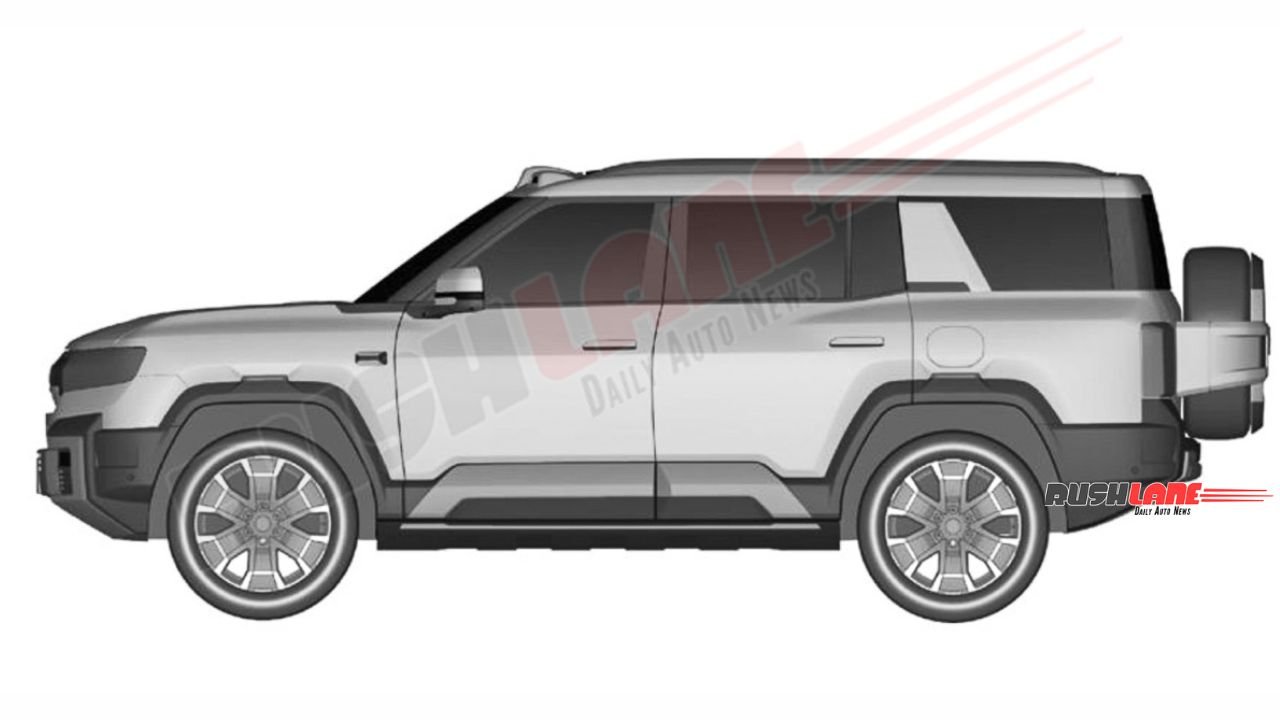 Chunky body cladding, a semi-open grille with vertical slat design, roof rails, large ORVMs, clamshell bonnet, upright windshield, muscular door cladding, flush door handles, large glass area with thick C pillar design, tailgate-mounted spare wheel, conventional LED tail lights, high-mount stop light, strong looking rear bumper and other elements are notable.