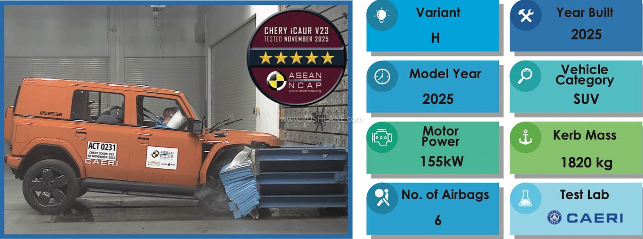 The crashed vehicle was the Chery iCaur V23 H variant which was manufactured in 2025 with a 208 bhp electric motor and weighs 1,820 kg. The V23 offers 6 airbags as standard along with ABS and ESC across all variants. It was manufactured in China for markets such as Brunei, Indonesia, Malaysia, Philippines, Singapore, Thailand and Vietnam.