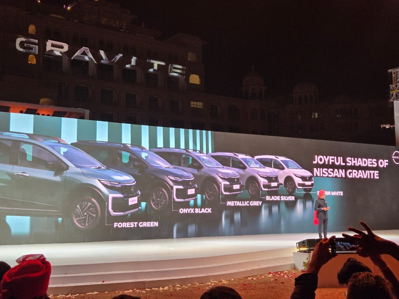 The Gravitas is essentially based on the Renault Triber platform but features Nissan-specific styling. The front fascia gets a larger grille, more angular bumpers and distinctive LED DRL treatment. The color options displayed include Forest Green, Onyx Black, Metallic Grey, Blade Silver and Storm White. Inside, the Gravitas offers a practical 7-seater layout with removable third-row seats. The second row seats get sliding and reclining functions for flexibility.