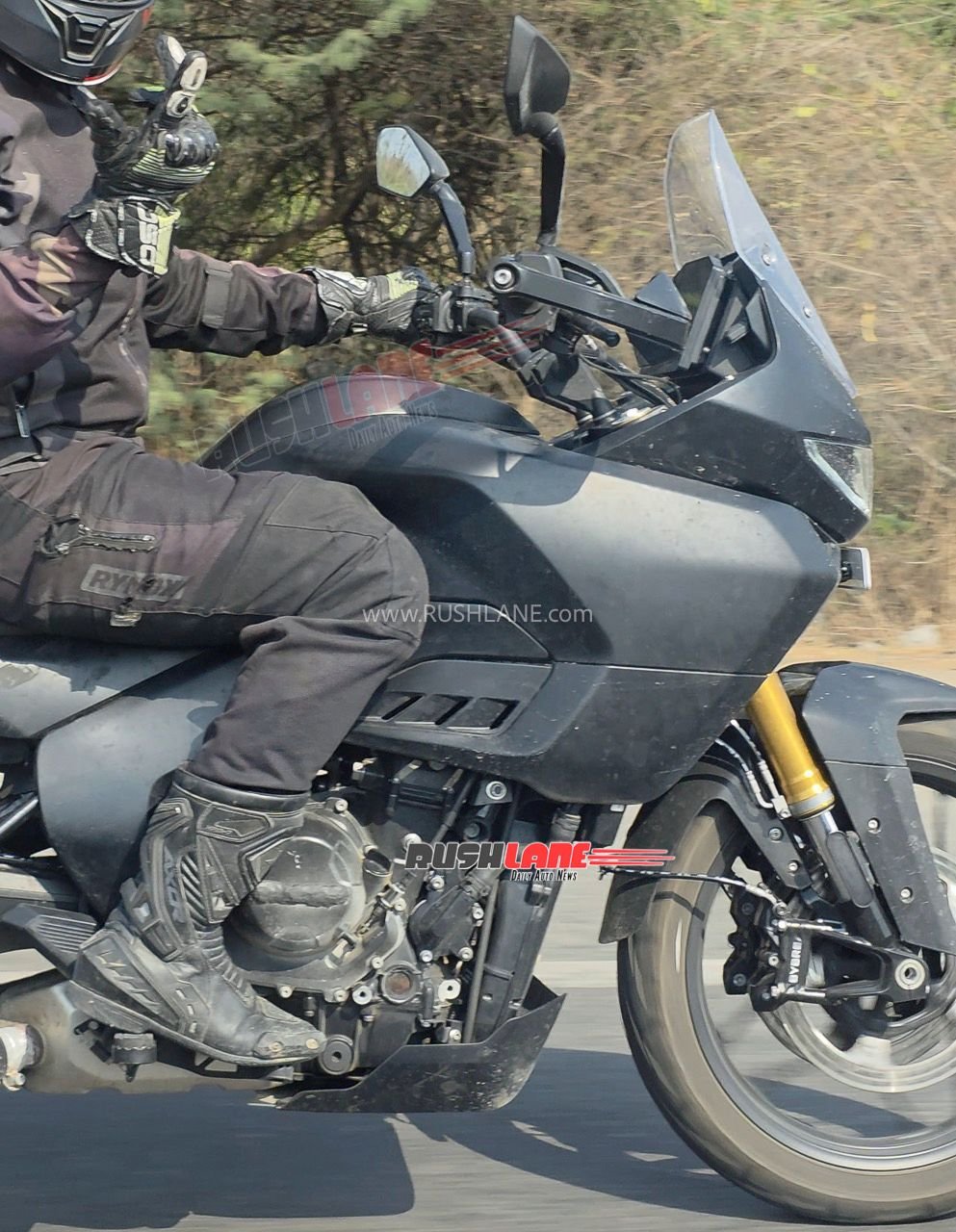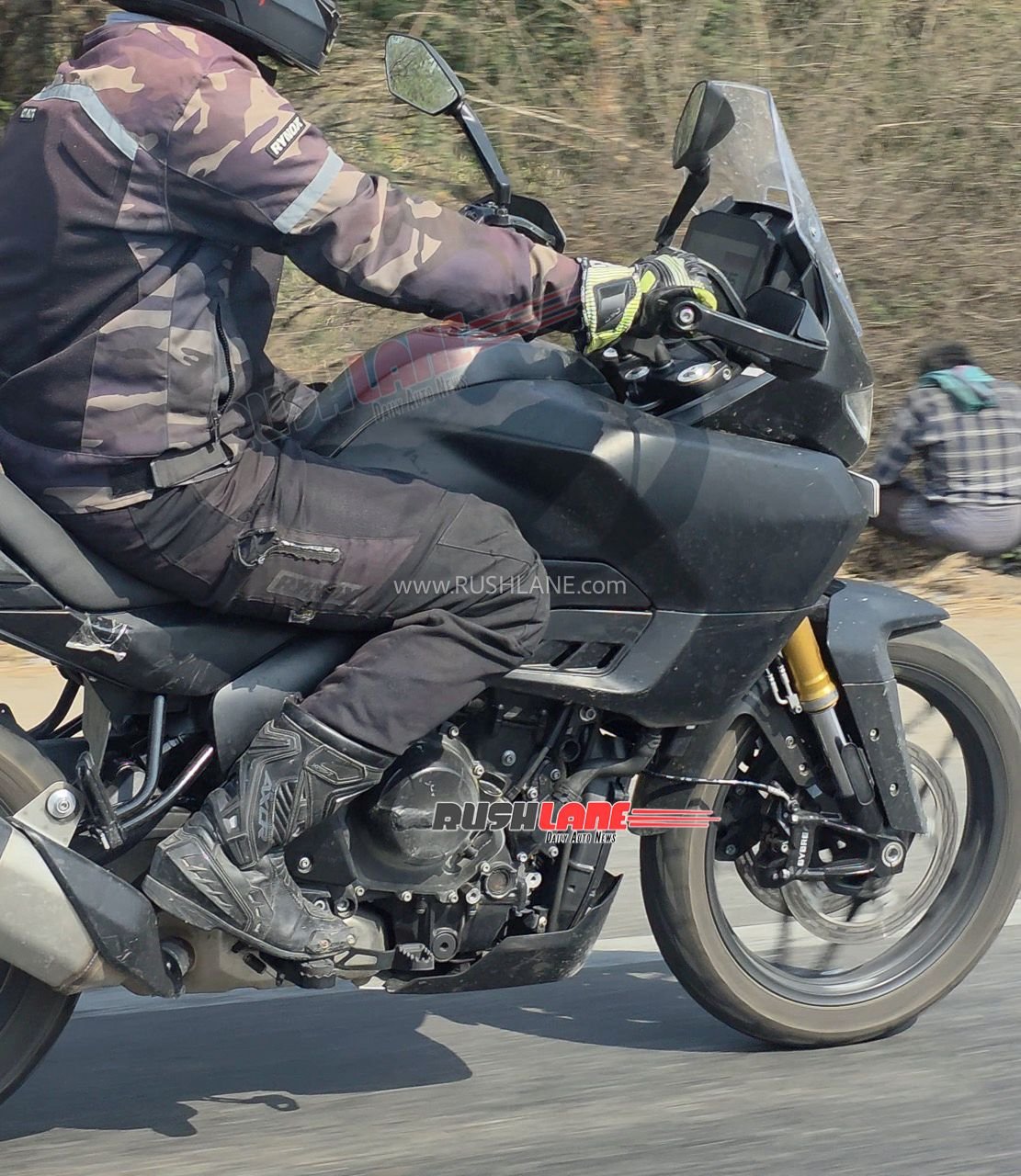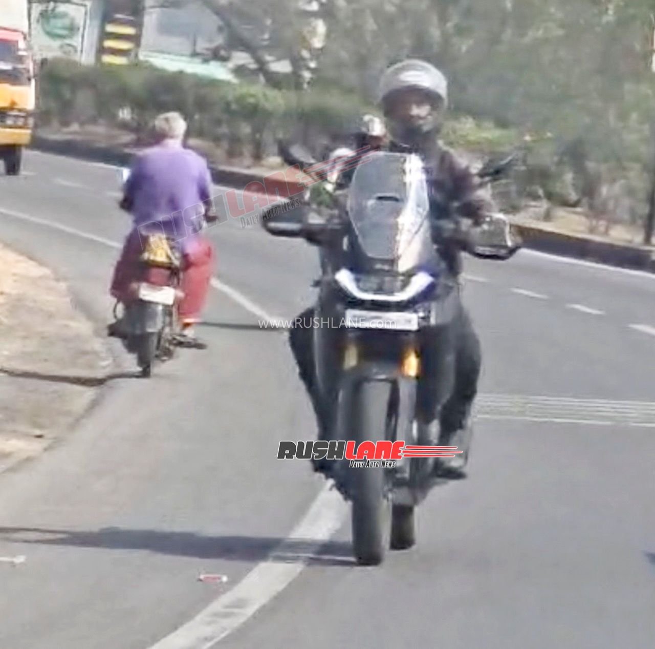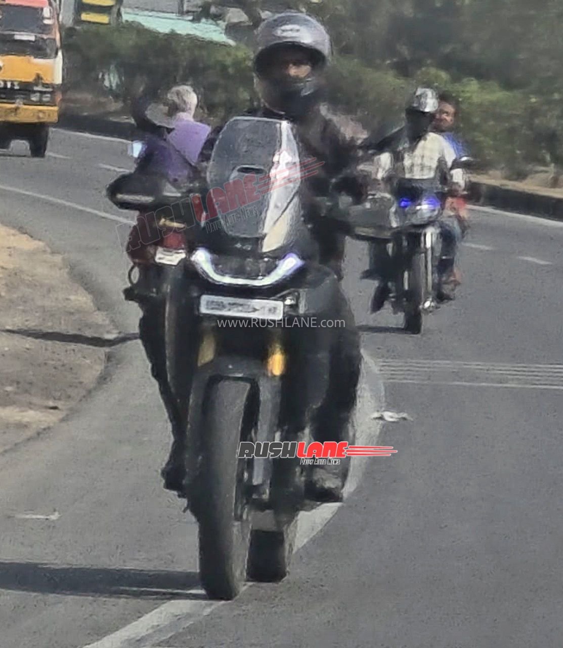At the front, it gets a twin projector headlamp setup along with a distinctive LED DRL signature. The lighting unit looks neatly integrated into a semi-faired design, giving it proper ADV-tourer appeal. A tall windscreen sits above the headlight cluster, suggesting good wind protection for long distance journeys. The bike also appears to have assistive lighting elements, which are likely to improve visibility in low-light conditions.